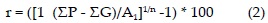 donde r es la tasa porcentual de cambio anual, A1 es el área de la categoría en cuestión al comienzo del período en estudio, A2 es el área de dicha categoría al final del período y n es el número de años del período. Puesto que: