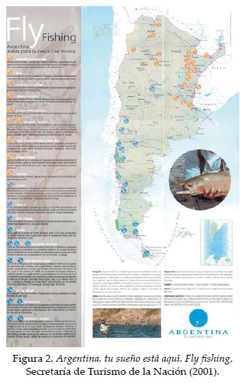 Los mapas turísticos temáticos, en general, brindan más información práctica ya que apuntan a un público con demandas más específicas. Por ejemplo, en el mapa Argentina, tu sueño está aquí. Fly fishing (2001; Figura 2) hay información sobre las áreas de pesca con mosca; en Cabalgatas en la Argentina (2003) hay datos sobre los operadores; en Argentina tu sueño está aquí. Turismo rural (2001) se indican las localidades que cuenta con establecimientos para desarrollar esa práctica; en Argentina, pesca mapa guía (2000) hay información pormenorizada sobre las distintas modalidades de pesca según la especie capturada: tipo de agua, de carnada, temporada de pesca, técnica adecuada (mosca, spinning, trolling);30 también hay datos pintorescos, como récordes y actividades típicas.
