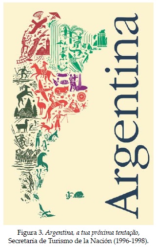 En este sentido, en la propuesta de los mapas de promoción turística hay una preocupación por satisfacer todas las demandas de los potenciales turistas, lo que se traduce en la multiplicación de la oferta de destinos, y de modalidades o prácticas de ocio y recreación. El resultado es un mapa plagado de atractivos turísticos en el que no pueden reconocerse las jerarquías: todos los puntos localizados son potenciales destinos turísticos. Así, esta cartografía turística participa en la invención de lugares turísticos. Los estereotipos turísticos aparecen intercalados con otras imágenes menos estandarizadas de esos lugares "inventados". Toda la Argentina es turística: cualquier rincón del país tiene algo para el disfrute y ocio turístico. En gran parte de los mapas, la estrategia gráfica consiste en cubrir con íconos y pequeños textos toda la superficie del territorio argentino, lo que da la apariencia de una distribución homogénea de los objetos y los lugares atractivos o de las modalidades. El mapa Argentina, a tua próxima tentação (1996-1998; Figura 3) escapa a esta generalización, pero potencia este tipo de imaginario turístico: los trazos que distinguen las regiones turísticas cubren toda la superficie del país, sin dejar huecos. Lo hace explotando recursos estéticos que responden más a los cánones del campo artístico que del cartográfico, pero refuerza la misma idea.