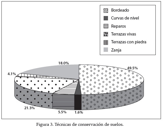 La rotación de cultivos permite contener más humedad y nutrientes y mejora el control de plagas y enfermedades. Por su parte, la conservación de suelos tiene un efecto directo sobre la calidad de éstos al mejorar sus capacidades productivas y ambientales. Las técnicas de conservación son practicadas por 1196 maiceros y las más importantes son: bordeado, curvas de nivel, reparos,2 terrazas de muro vivo, terrazas de piedra y zanjas (Figura 3).