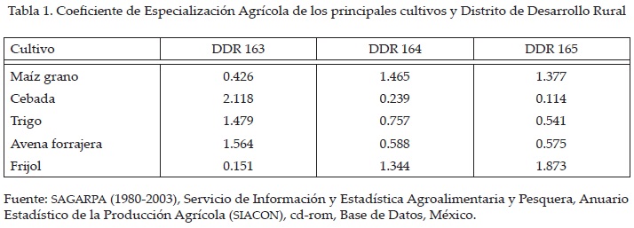 Al aplicar la ecuación número 1, se obtuvieron los resultados expuestos en la Tabla 1, donde se observa que el DDR 163 está especializado en cebada, trigo y avena forrajera, en tanto que los Distritos 164 y 165 están especializados en cultivos básicos (maíz y frijol).