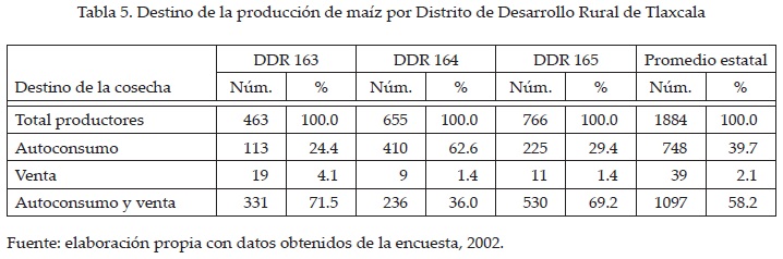 Finalmente, en el ámbito regional sobresale que los DDR 164 y 165 están especializados en la producción de maíz y frijol (Tabla 1), lo que puede indicar que cuando los productores poseen predios agrícolas pequeños o cultivan en condiciones climáticas desfavorables, priorizan la siembra de granos básicos, por el papel esencial que tienen en su reproducción social. En el estado, del total de maíz cosechado sólo el 2.1% se destina al mercado, siendo menor este porcentaje en los DDR 164 y 165 (Tabla 5). De esta forma los maiceros evitan una mayor extracción de excedentes económicos al prescindir, por un mayor tiempo, de la compra de tortilla, masa y otros bienes en los mercados locales.