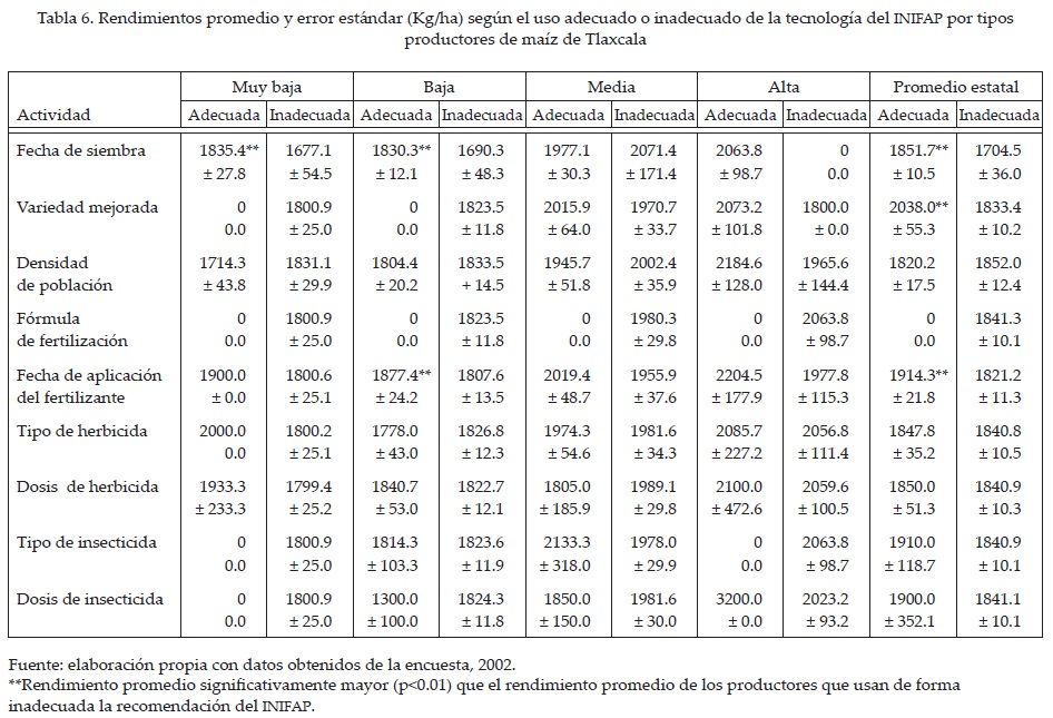 La discontinuidad tecnológica de los maiceros se expresa en el uso inadecuado que hacen los productores de la tecnología recomendada por el INIFAP: 96.2% en variedades mejoradas; 66.3% en densidad de población; 100 y 78.5% en las fórmulas y fechas de aplicación de fertilizantes; 92.7 y 96% en los tipos y dosis de herbicidas; y 99.5 y 99.7% en los tipos y dosis de insecticidas. Sólo la fecha de siembra fue apropiada por el 92.9% de los productores. Pero también se manifiesta en la reducción del rendimiento de los factores productivos (Tabla 6). Lo relevante de estos datos, es que en cuatro actividades del ciclo agrícola hay diferencias significativas entre los rendimientos de los productores de menor apropiación que usaron adecuadamente la tecnología versus su uso inadecuado.