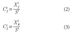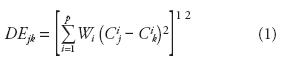 en la cual, j corresponde al sitio que se analiza con respecto a la estación base k, p es el número de atributos que incluye la Distancia Euclidiana, cada uno de los cuales tiene un peso o ponderación Wi, Cij y Cik son magnitudes estandarizadas del atributo i en las estaciones j y k. La estandarización de los atributos se realiza dividiendo los datos originales entre la desviación estándar sesgada, calculada para cada atributo con el total de estaciones analizadas (NE), en el estudio ahora expuesto igual a 67 (Tabla 1). El proceso de estandarización elimina las unidades de cada atributo y reduce sus diferencias. Entonces: