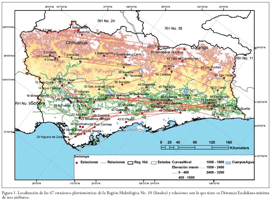 En la Tabla 2 se presentan las tres DEjk mínimas encontradas para cada estación base citada por nombre y las auxiliares indicadas por número. En la Figura 1 se indica con un trazo recto la mayor similitud de cada estación pluviométrica, es decir, su menor DEjk con otra estación. Se observa que se define una primera subregión hacia el este de la región con altitud mayor de los 501 msnm en la estación Batopilas y de los 885 msnm en Dolores. Esta subregión de montaña la forman las estaciones: 1 a 11 y de la 60 a la 67, incluyendo a las 38 y 45.