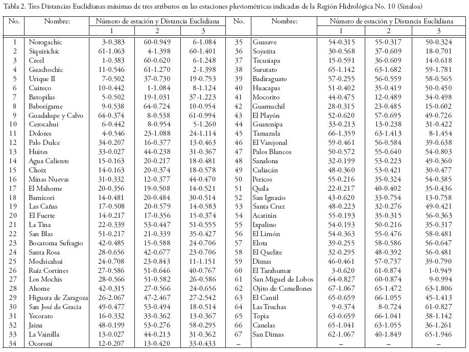 Al tomar en cuenta que las DEjk mínimas calculadas fluctúan (Tabla 4), desde 0.106 entre Minas Nuevas y Ocoroni hasta 2.270 entre Higuera de Zaragoza y San Dimas, se optó por integrar las RDI de cada pluviómetro con base en las diez DEjk mínimas, las cuales se presentan en la Tabla 4.