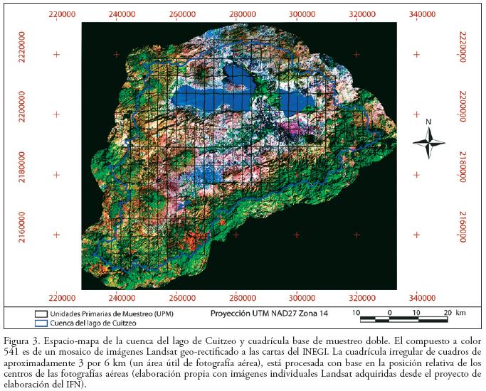 Los muestreos dobles fueron operados en dos etapas: primero con la selección de unidades primarias de muestreo (UPM) que corresponden a un área útil fotointerpretable de fotografía aérea y, segundo, con la selección de unidades secundarias de muestreo (USM), que son puntos seleccionados dentro de las UPM seleccionadas en la primera etapa. La Figura 3 representa un mosaico de imágenes Landsat que sirvieron a la elaboración del mapa IFN, georectificadas a las cartas topográficas 1:50 000 del INEGI. El centro de cada fotografía aérea fue primero ubicado en los mapas topográficos a escala 1:50 000. Para obtener la cuadrícula base visible en la Figura 3, se construyó una malla a partir de los puntos equidistantes a dos centros contiguos de fotografía. La cuadrícula se dibujó juntando con líneas rectas los nodos de esta malla; luego, si su centro caía fuera de la cuenca, se eliminaron los cuadros de la cuadrícula base. Así, el carácter aleatorio de las selecciones fue preservado a la orilla de la cuenca (Zhu et al., 2000). Al final, la cuadrícula base comprendió 218 fotografías (Figura 3).