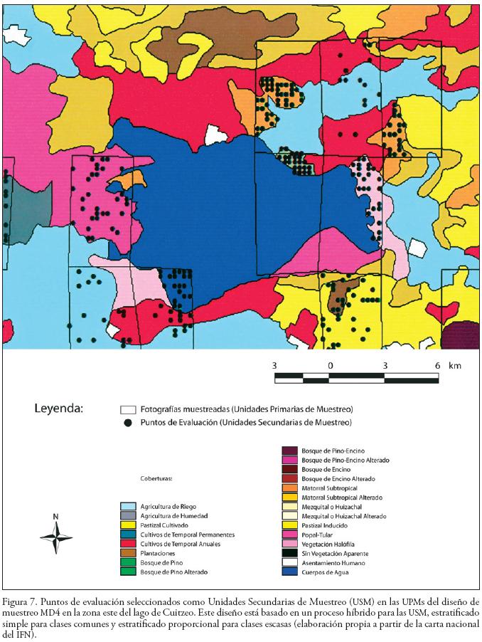 Faltan métodos para evaluar la confiabilidad de mapas de Cobertura Vegetal y Utilización de Suelo (CVUS) a escala regional, adaptados a zonas subtropicales. El objetivo del artículo fue presentar un método para la evaluación del mapa del Inventario Forestal Nacional de México (IFN), y proporcionar resultados de su implementación sobre la cuenca del lago de Cuitzeo. Se probaron cinco diseños de muestreo para evaluar el mapa a nivel comunidad, de los cuales, los diseños de muestreo doble lograron mayor control espacial sobre la muestra que el muestreo simple, permitiendo controlar los costos de adquisición e interpretación de fotografías aéreas.