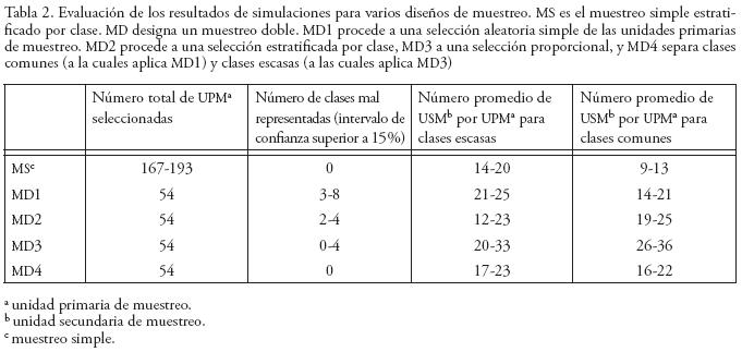 En el diseño MD2, la selección de las UPM se operó separadamente para cada clase, permitiendo que todas las UPM, donde la clase estuvo presente, tuvieran igual probabilidad de inclusión. En este diseño, si una UPM contenía solamente un punto (USM) de la clase k, la probabilidad de estar seleccionada era igual que otra con 50 puntos de la clase k. En el caso de una clase escasa muy fragmentada, se necesitó entonces un alto número de UPM para alcanzar el tamaño de 100 USM. Por esta razón, las simulaciones mostraron que más de 80 UPM en total fueron necesarias para cubrir las 21 clases, lo que rebasaba la cantidad admitida de fotografías (54). Aunque más viable que MD1, el diseño MD2 resultó inadecuado para mantener costos bajos. Por otra parte, la computación de las probabilidades de inclusión en la segunda etapa del diseño resultó complicada (dependía de la frecuencia de la clase en cada una de las UPM) y no se pudo hacer de manera automática vía SIG.