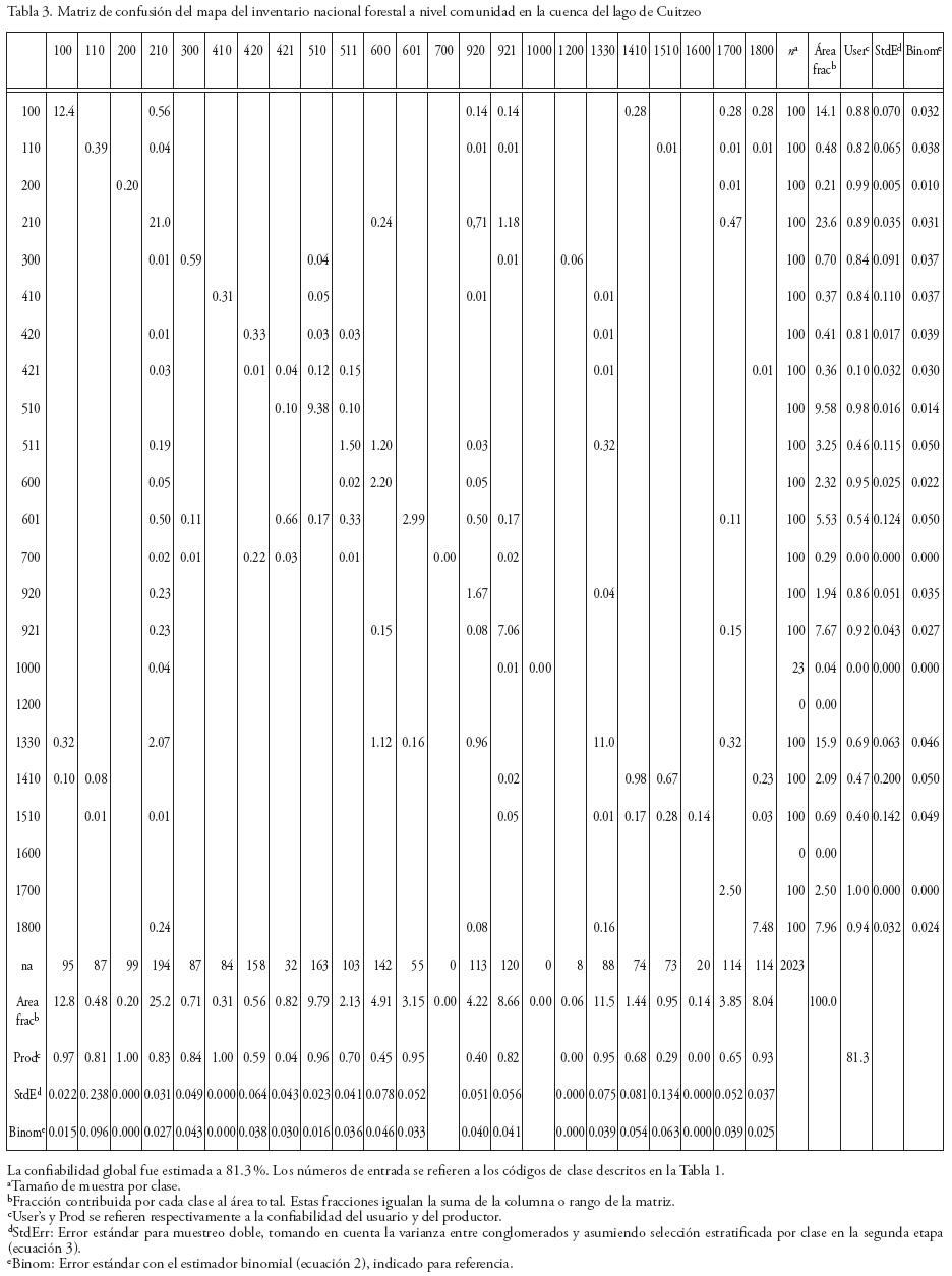 Para obtener una precisión aceptable (d< 0.10) de acuerdo con la ecuación (2), se fijó el tamaño de muestra (el número de Unidades Secundarias de Muestreo) a n = 100 por clase cartografiada (Mas et al., 2003). Este valor de n = 100 es un valor típico para estudios de confiabilidad a escala regional con diseños de muestreo doble (Stehman y Czaplewski, 1998).