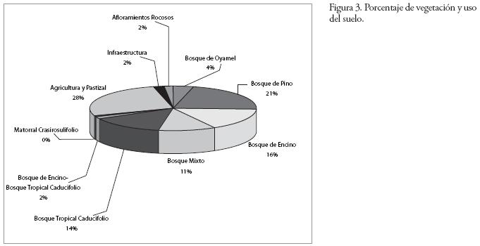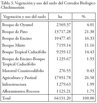 El 69.24% del Corredor Biológico Chichinautzin presenta cobertura forestal, lo que le da importancia desde el punto de vista de conservación de recursos naturales. Los bosques de coníferas representados por oyamel (Abies religiosa); pino (Pinus teocote, P. Montezumae, P. Pseudostrobus, P. Leyophila, P. Rudis, P. Hartwegii, P. Lawsoni), cubren una superficie de 16 286.65 ha, que representa 25.39% y los bosques de latifoliadas caracterizados por bosque de encino (Quercus rugosa, Q. microphila, Q. candicans, Q. castanea, Q. hartwegii, Q. obtusata, Q. laurina, Q. diversifolia, Q. acutifolia, Q. conglomerata); la selva baja caducifolia (Lysiloma acapulcensis, L. divaricata Ceibaaesculifolia, Ipomea murucoides, Juglans mollis, Trichilia hirta, T. pringlei, Bursera copallifera, B. glabrifolia, B. fagaroides, Heliocarpus terebinthinaceus, Leucaena microphylla y Ficus sp.) ostentan una superficie de 20 972.24 ha, equivalente al 32.69% del total del ANP, mientras que el bosque mixto caracterizado por diversas especies de pino, encino y otras latifoliadas (Arbutus xalapensis, Juniperus flaccida, Ternstroemia pringlei) mantiene el 11.16% de superficie que equivalen a 7159.14 ha (Figura 3).