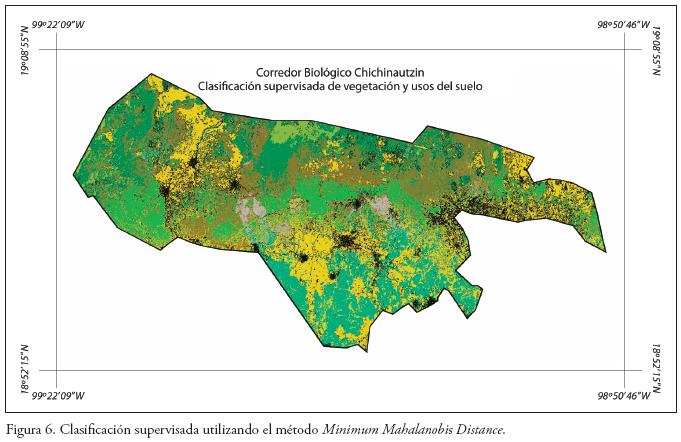 Si bien la fiabilidad de la clasificación supervisada no alcanzó los valores mínimos mencionados por Anderson et al. (1976), se consideró conveniente utilizar esta misma como base inicial para separar, de forma más adecuada a la realidad, mediante interpretación visual, las unidades de vegetación y usos del suelo del Corredor Biológico Chichinautzin.