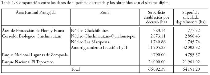 La definición de los límites se realizó considerando las coordenadas de los vértices establecidos en los decretos publicados en el Diario Oficial de la Federación para cada una de las áreas naturales protegidas que la integran. Fueron elaborados con ayuda de los sistemas de información geográfica AutoCad Map 2000 e ILWIS 3.0. Al ser elaborados digitalmente y encontrarse sujetos a cálculos precisos, se presenta una discrepancia en los valores de las superficies decretadas y los obtenidos en el sistema digital; lo cual no significa que los valores de las superficies obtenidos digitalmente sean erróneos; en último caso, corresponden a los valores reales de superficie en función de las coordenadas establecidas en los decretos para cada vértice. De esta forma, y dado que es prácticamente imposible ajustar los datos digitales con los datos de superficie establecidos (Diario Oficial de la Federación, 19 de mayo, 1947), el análisis de los resultados se realizó con los datos de superficie que el sistema digital calculó (Tabla 1).
