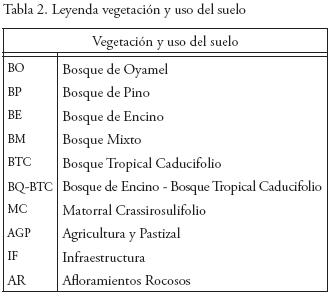 La leyenda de trabajo (Tabla 2) se estableció en función de los diferentes tipos de vegetación y usos de suelo presentes en el Corredor Biológico Chichinautzin, además de considerar las observaciones realizadas durante los trabajos de campo e interpretación aerofotográfica, considerando las características de la vegetación (Rzedowski, 1983).