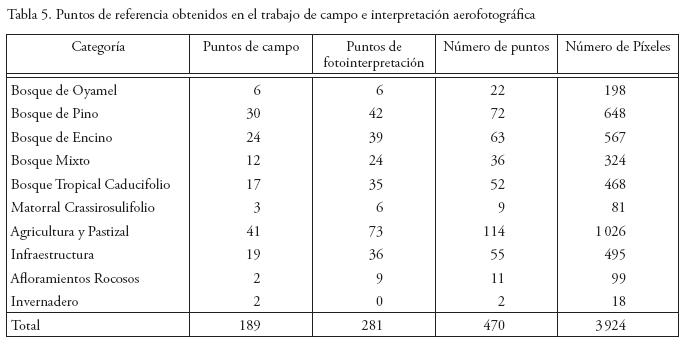 Además de los puntos obtenidos en campo, se utilizaron fotografías aéreas digitales para ampliar el número de puntos muestra; durante su adquisición se obtuvo un mayor grado de referencia espacial de la distribución de los tipos de vegetación y usos del suelo en el corredor, que posteriormente sirvió para elaborar con mayor precisión la interpretación visual. El total de puntos muestra de referencia, considerando los de trabajos de campo y los obtenidos mediante fotointerpretación, sumaron un total de 470 (Tabla 5).