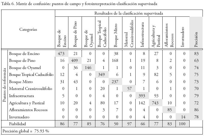 La clasificación digital fue sujeta a un análisis de fiabilidad para estimar la precisión de los resultados de este proceso; se realizó una matriz de confusión en la cual se compararon los puntos de reconocimiento de campo y los derivados de la interpretación estereoscópica de fotografías aéreas digitales. Se rasterizaron a una resolución de 30 m y se estableció una superficie de 90 x 90 m (3 x 3 píxeles) dado que en el trabajo de campo y fotointerpretación fueron elegidas áreas que superaban estas superficies.
