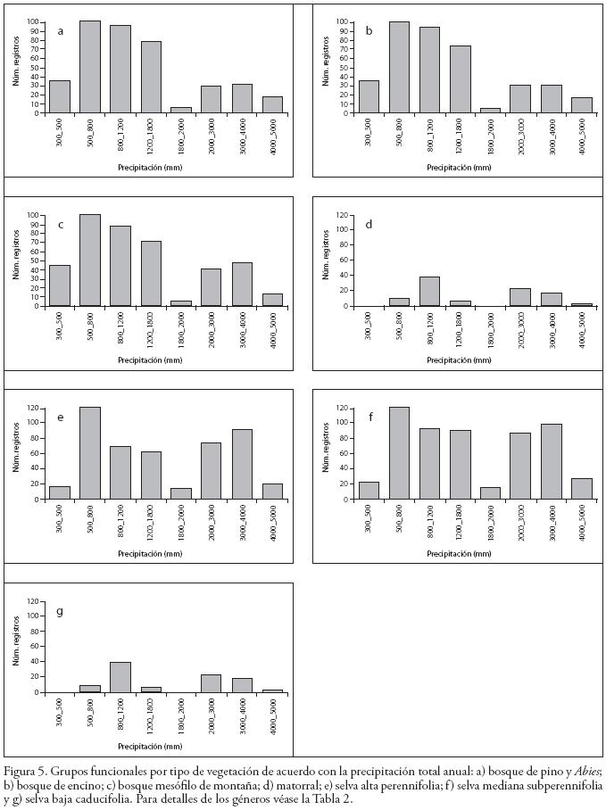 De acuerdo con la precipitación, los géneros como Quercus, Pinus y Abies presentes en bosques templados y mesófilos se distribuyen entre los 1 000 y 2 500 mm anuales (Tabla 2). Los géneros de Acacia, Mimosa y Brahea presentes tanto en matorrales como en selvas bajas caducifolias, se distribuyeron en rangos de precipitación entre los 500 y 800 mm. Entre los 2 000 y 4 000 mm se distribuyeron los géneros típicos de bosques mesófilos Clethra, Dendropanax, Miconia y Percea (Tabla 2). El mayor número de registros de sitios de colecta en los bosques templados y mesófilos se distribuyó entre los 500 y 1 800 mm, mientras que para las zonas de matorrales y selvas secas, éste se presentó entre los 800 y 1 200mm (Figura 5). Los géneros de selvas altas y medianas presentaron mayores registros entre los 500 y 4 000 mm (Figura 5). Estos resultados sugieren que las especies de arbustos y árboles de bosques de pino y abetos, bosques de encino y bosques mesófilos, comparten tolerancias pluviométricas.