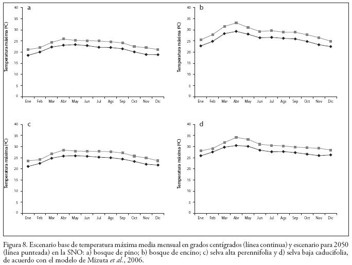 De acuerdo con el escenario japonés (Mizuta et al., 2006) con resolución de 20 x 20 km para el 2050, las temperaturas mínimas presentarán un mayor aumento en abril y noviembre, y menores incrementos en marzo y diciembre. Los bosques de encino y pino presentarán mayor aumento en las temperatura mínimas (entre 2.5 y 3.0°C) que las selvas bajas y selvas altas perennifolias (de 1.5 a 2.5°C; Figuras 7a y 9). Las temperaturas máximas se incrementarán entre 1.5 y 4°C para 2050 y los mayores aumentos (> 2.5°C) se presentarán en los bosques de encino y las selvas bajas caducifolias. En contraste, los menores aumentos (entre los 1.2 y 2.5°C) se presentarán en los bosques de pino y las selvas altas perennifolias (Figuras 7b, 8a y 8c). En relación con la época del año, los mayores aumentos de temperatura máxima se presentarán en abril y noviembre y los menores en marzo y diciembre (Figuras 7a y 8). Los cambios en la precipitación se caracterizaron por decrementos significativos en invierno (hasta menos de 100 mm por mes) de noviembre a marzo, y aumentos de hasta 150 mm en julio (Figuras 7c y 10). Las mayores precipitaciones ocurrirán en julio en los bosques de encino en el verano, y en agosto en las selvas bajas y en julio en las selvas altas, observándose, en general, veranos más secos (Figura 7c, 10). Los bosques de pino sufrirán un descenso en la precipitación invernal (Figura 7c, 10a).