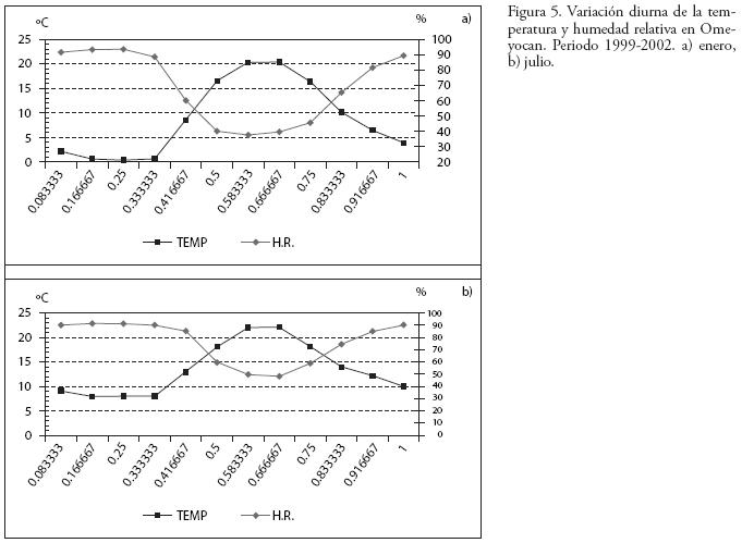 Como era de esperar, la humedad ambiente en el bosque Omeyocan es elevada debido a la presencia del arbolado y varía de 90% de humedad relativa durante la noche y hasta el amanecer, descendiendo a la mitad de dicho valor durante las horas del mediodía y por la tarde. En la Figura 5 aparece para los meses de enero y julio el recorrido medio de la temperatura el cual, como es sabido, es inverso al correspondiente a la humedad relativa.