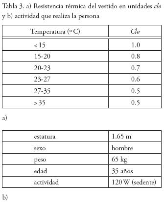 Ambos métodos consideran el confort humano tomando en cuenta las cuatro variables climatológicas que afectan al ser humano: temperatura, humedad, viento y radiación del entorno, además de dos variables personales como son cubierta de ropa modulada por la temperatura (Tabla 3a) la resistencia térmica del vestido (en unidades clo) y la actividad que realiza la persona (Tabla 3b).