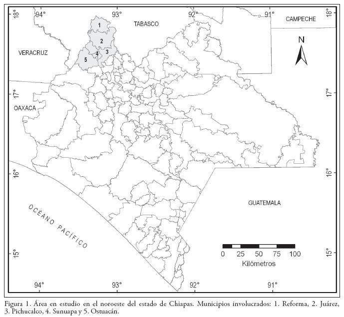 El entorno regional del territorio de estudio corresponde al extremo noroccidental del estado de Chiapas, México; limitada al oeste y al este, por las cuencas de los ríos Grijalva y Pichucalco, respectivamente; al norte, por la planicie lacustre de las lagunas La Ceiba, Limón y Santuario; y al sur, por las estribaciones montañosas del volcán El Chichón y la presa Peñitas. La extensión total del territorio es de 2 456.9 km2, estando limitado entre los 17° 17' 00'' y 17° 59' 00'' de latitud Norte, y los 93° 00' 00'' y los 93° 33' 00'' de longitud Oeste. Dentro del territorio están involucrados los municipios Pichucalco, Ostuacán, Reforma, Juárez y Sunuapa (Figura 1).