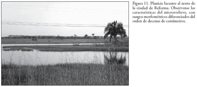 17. Planicies fluviolacustres con superficies esculturales acumulativas, muy bajas, planas, pantanosas, formadas sobre sedimentos lacunopalustres holocénicos (arcillas, limos, arenas). Son los tipos del relieve más jóvenes del territorio (Figura 11), condicionados por el régimen tectónico diferenciado en las planicies del norte de Tabasco. En estos sectores es evidente la actividad de procesos de subsidencia actual. En un futuro sería recomendable la determinación de la "naturalidad" de este proceso, o si es el resultado de procesos antrópicos de inducción contemporánea, debido a la extracción petrolera.