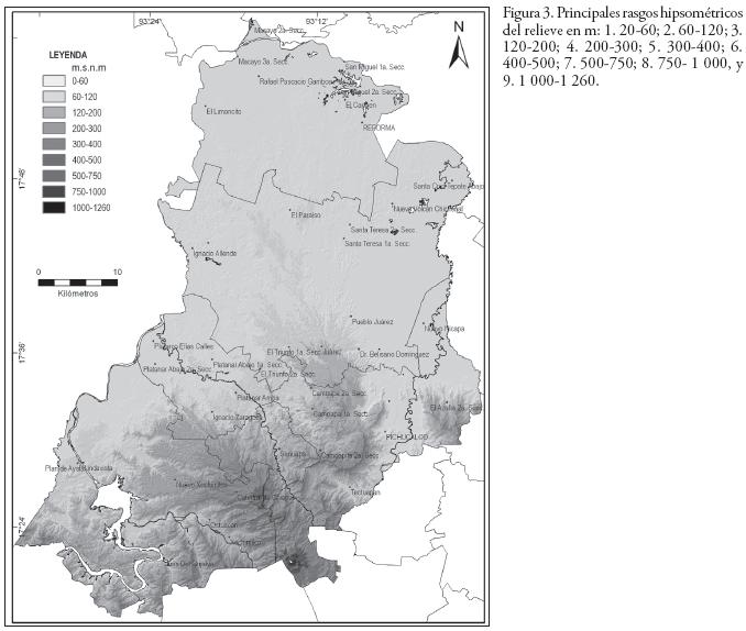 En el territorio las características hipsométricas del relieve reflejan un gran núcleo montañoso, compuesto por la edificación volcánica de El Chichón, con una altitud de 1 260 m y las cúspides de los cerros El Cucayo, El Zopilote y otros, en la zona centromeridional, con altitudes entre 900 y 1 100 m. Rodeando este núcleo sobresalen las áreas premontañosas del valle del río Grijalva, de Amacoite Segunda, del cerro La PiguaMaspac, de Nuevo Xochimilco, de Sunuapa, del LlanoSambaCerro de Cal, de la Sierra de Manchas Blancas y de Cerro Santa Cruz, todas con altitudes máximas entre 400 y 800 m (Figura 3).