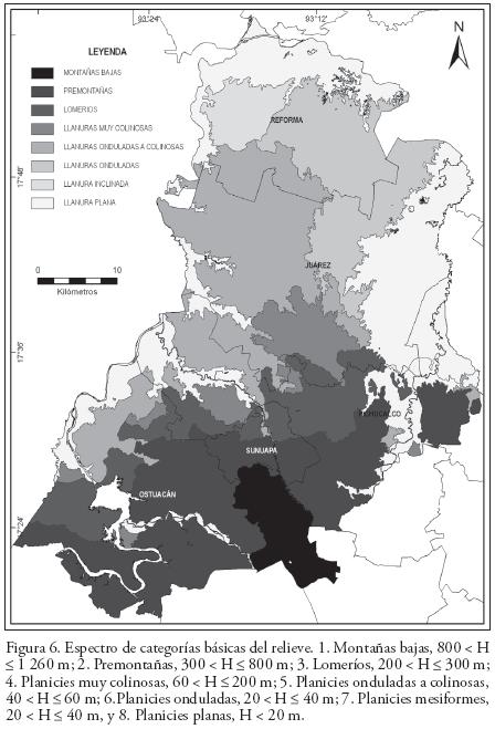 Las pendientes con valores entre 18.1°30° y 30.1 °45°, se presentan en las premontañas y en los lomeríos altos, que las circundan por el norte; así como muy aisladamente en los lomeríos bajos, y en las planicies altas y muy altas, colinosas y muy diseccionadas. Finalmente, en las planicies medias, de colinosas a onduladas y ligeramente diseccionadas, situadas al norte y al este del territorio, predominan los valores entre 6. I°12° y 12. I°18°; y en las bajas, planas (planicies acumulativas de inundación de los ríos Grijalva y Pichucalco, y planicie lacustre septentrional de Reforma), la inclinación alcanza valores inferiores a los 2°.