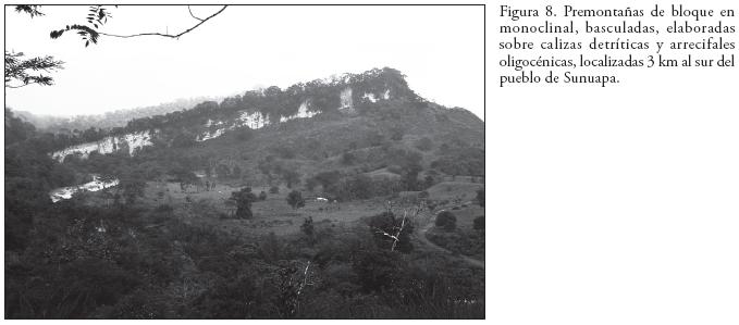 2. Montañas bajas con superficies esculturales erosivodenudativas, sobre areniscas terrígenas miocénicas, con aislada cobertura piroclástica pliocuaternaria y afloramientos dispersos de rocas calcáreas con procesos erosivokársticos; profundamente diseccionadas, con desarrollo de cortezas de intemperismo. Este tipo de relieve se localiza en las montañas pertenecientes a los cerros El Zopilote y El Cucayo, donde existe un patrón morfotectónico del relieve con orientación nortesur. Un elemento morfológico singular de esta zona es la presencia de afloramientos calcáreos en las cumbres, determinando la formación de crestas "blindadas", muy basculadas (Figura 8).