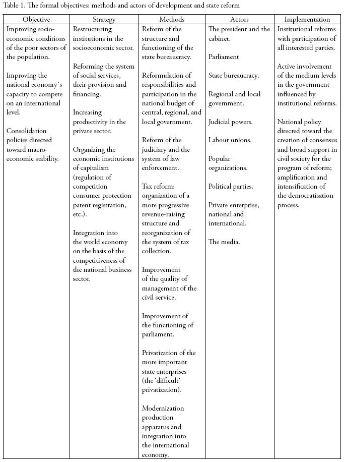 Table 1 presents the general characteristics of the process of state reform initiated in the 1980s and 1990s and mentions the elements that figure with differing emphasis in the present debate in Latin America on the relation between stable longterm economic growth, changes in the structure and functioning of the state apparatus, and the reforms of statecivil society relations. These elements indicate a general direction of the reform process. The specific arrangements between state and market and the impact of adjustment policies on social classes and other interest groups often differ considerably among countries. Structural adjustment has produced its own winners and losers. The privatization of public services and the reductions in subsidies, public social services and welfare provisions have worsened the distribution of income, already skewed to the disadvantage of lower and middle income families. The recent tax reforms initiated by many countries have not been able to correct this trend. The emphasis on indirect taxes (linked to the consumption of goods and services with a low incomeelasticity of demand) must shift to taxation based primarily on income and property. The reorganization of the revenue service a priority objective of state reform is only in its beginning stages, and the traditional regressive state revenueraising structure is largely intact. Thus the lower and middle income strata are forced to contribute comparatively more to a state that has reduced its support of the public services that primarily serve their needs (Valderrama, 1995).