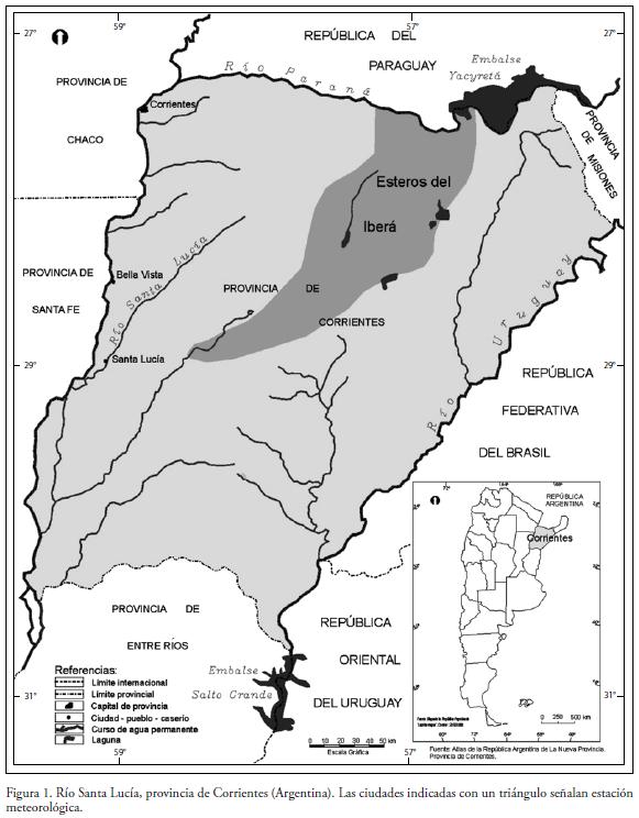 El área en estudio (Figura 1) se localiza en la provincia de Corrientes (Argentina), donde el río Santa Lucía y la cuenca homónima (6 200 km2) es la base de esta aplicación. Los promedios de precipitación anual en toda la provincia oscilan entre los 1 100 y 1 200 mm, y decrecen de noreste a suroeste. Las mayores precipitaciones se producen durante los meses correspondientes a otoño y primavera. El río nace en los esteros del Santa Lucía y desemboca como afluente en el Río Paraná conformando parte del Sistema del Río Paraná y se desarrolla en dirección norestesuroeste. La elección de las estaciones climatológicas respondió a su cercanía con el curso de agua y a la existencia de datos de temperatura y precipitación. La provincia cuenta con gran cantidad de lagunas y esteros, los que albergan flora y fauna muy diversa. La laguna del Iberá divide a la provincia en dos zonas: la occidental y la oriental. La cuenca del Río Santa Lucía pertenece a la primera de ellas (Urien y Colombo, 1991).