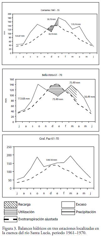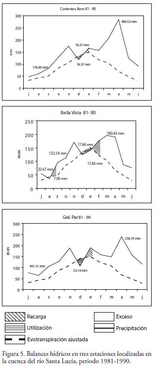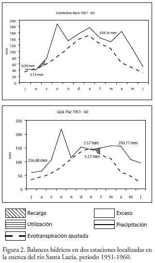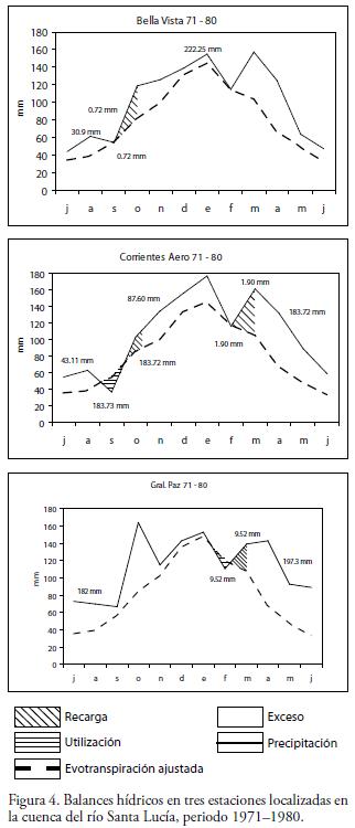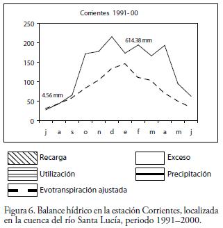 En el caso específico de la cuenca del río Santa Lucía, casi la totalidad de los balances, a escala espacial, tanto como a escala temporal, indicó un exceso de agua considerable. En algunos casos los excesos superaron los 600 mm anuales. Ello fue suficiente para cubrir la necesidad de los cultivos en los meses âdiciembre, eneroâ, en los que la precipitación se mostraba menor que las salidas del sistema. En otro sentido, se halló correlación significativa entre los valores de precipitación y el aumento de los caudales. Entre ambas distribuciones no se reconocieron desfases relevantes.