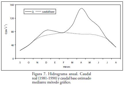 El escurrimiento mensual real para el río se calculó utilizando los caudales aforados durante los periodos 19811990 y 19912000. En el primer caso, el caudal medio anual fue de 75.3 m3s1 y el específico de 12.2 l s1km2. Durante los años 19912000, el caudal medio fue superado (76.71 m3s1) al igual que el específico (12.74 s1km2). Este último hace referencia al volumen por unidad de superficie por lo que representa el caudal aportado por cada kilómetro cuadrado de cuenca.