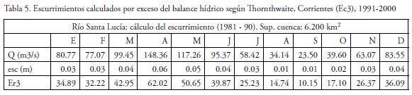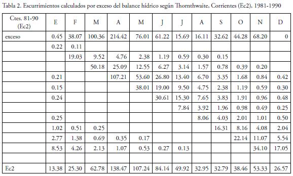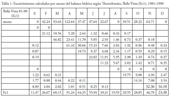 Por lo tanto, sobre la base de los excesos de los balances hídricos se determinó el escurrimiento superficial mensual esperado según el Método de Thornthwaite (Thorntwaite y Mather, 1957).