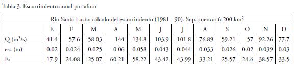 En las Tablas 3 y 4 se detalla el escurrimiento anual en el aforo Santa Lucía (198190 y 199100). En la Figura 8 se muestra la variación de ambos escurrimientos a lo largo del año, en las dos décadas.
