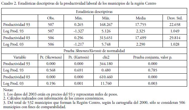 En primer lugar, el Cuadro 2 muestra las estadísticas descriptivas y una prueba de normalidad de los datos de productividad del trabajo de los municipios de la región Centro, basada en una prueba skewnesskurtosis. Los resultados muestran cómo los datos de productividad se alejan fuertemente de un comportamiento normal cuando no se realiza una transformación logarítmica.