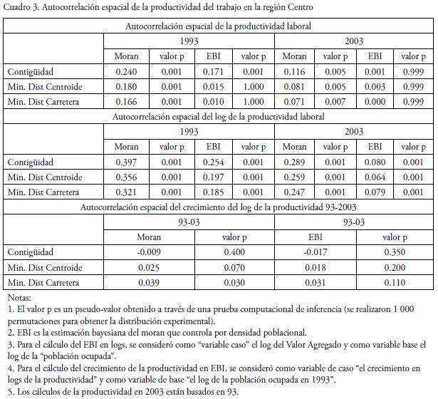 El Cuadro 3 presenta el índice de Moran bajo tres tipos de fricción de la distancia para medir la productividad del trabajo en el periodo 19932003 a nivel municipal: a) centroide, b) carretera y c) vecinos contiguos.9