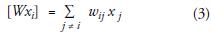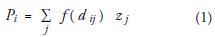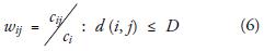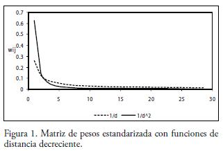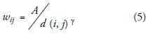 De esta manera, la cercaníarelevancia entre el lugar (i) y lugar (j) está reflejada en los pesos asignados (wij). El tipo de pesos usados son determinados a priori, pero éstos bien pueden reflejar una distance decay function como la de la expresión (2) que es usada en el modelo clásico gravitacional.