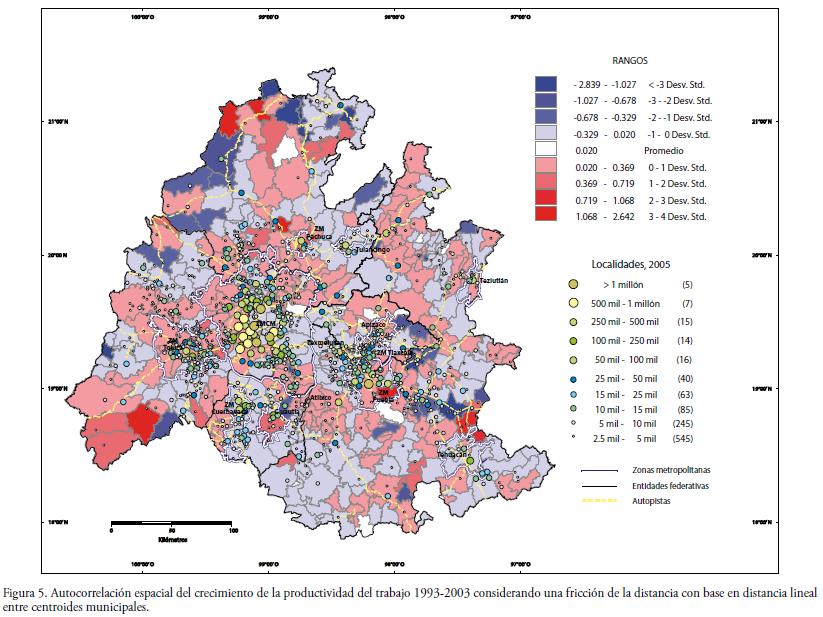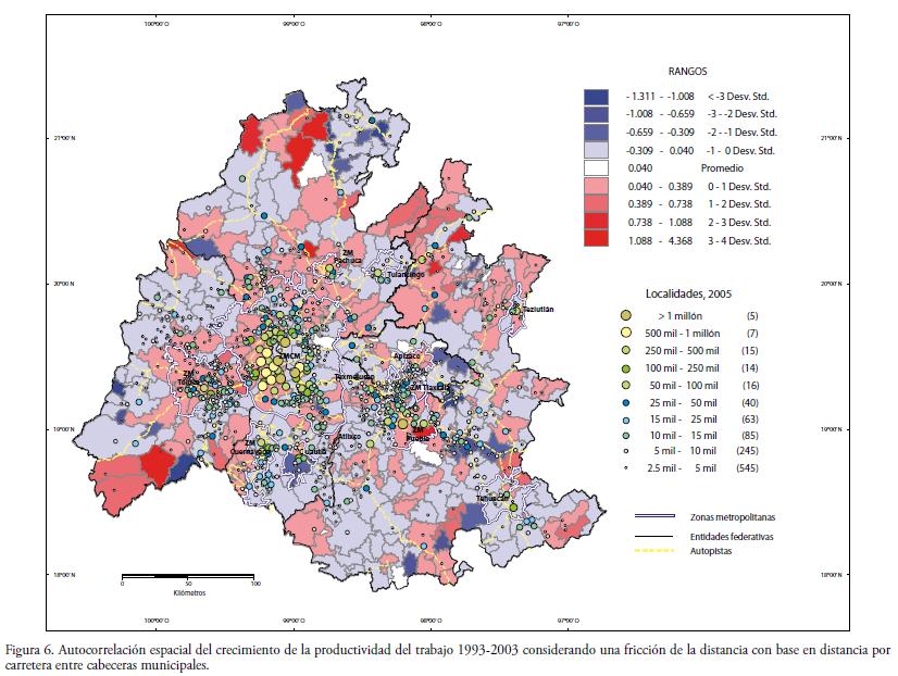Lo que sí es común encontrar en la literatura que trata el asunto de la distribución regional de la productividad (De Gallo y Etur, 2003), es trabajar con una transformación en logaritmos naturales, con ello implícitamente se aminoran los problemas anteriormente mencionados. En dado caso, en las mediciones que se realizarán posteriormente en la siguiente sección se incorporarán algunas mediciones de autocorrelación que corrigen la heterogeneidad poblacional (véase sección "Efecto de la fricción de la distancia en la autocorrelación espacial de la productividad de la región Centro").