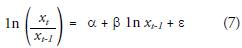 donde el vector x denota la productividad del trabajo para todos los municipios de la región Centro en un determinado año y ε es un vector de errores. Como se refiere en la literatura, esta ecuación puede ser interpretada como una implementación lineal del modelo neoclásico de crecimiento para evaluar la hipótesis de convergencia absoluta (SalaIMartin, 1996). El Cuadro 4 muestra los resultados para el periodo 19932003.