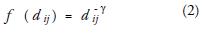 Cuando el parámetro γ toma el valor de uno, ecuación (1) emula un modelo gravitacional newtoniano (i.e. la interacción espacial es inversamente proporcional a la distancia entre i y j). Ecuaciones del tipo (1) pueden ser implementadas empíricamente para evaluar si existe una distant decay function en los modelos de interacción espacial (i.e. encontrar un parámetro γ negativo).