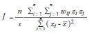 es la media de las observaciones en toda la región, y la sumatoria sobre j es tal que sólo incluye a unidades regionales vecinas de i. La matriz de interacción espacial responde a la "fricción de la distancia" considerada en cada cálculo.