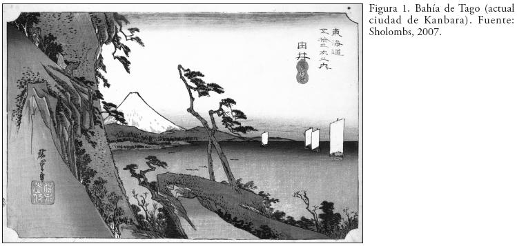 En un intento de seguir el pensamiento del autor, se ha buscado el mismo ángulo para el lector, esta vez, en un grabado de Utagawa basado en la técnica Ukiyoe, del siglo XIX, para apreciar la lejanía y, al fondo, el volcán Fuji desde la Bahía de Tago (Figura 1).