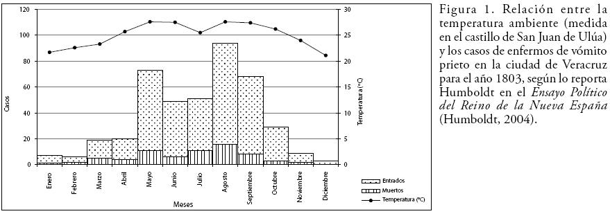 Para 1803, Humboldt encuentra una relación clara entre afectados por el llamado vómito prieto y la temperatura medida en el castillo de San Juan de Ulúa por el Capitán Bernardo de Orta, como se presenta en la Figura 1 (Humboldt, 2004).