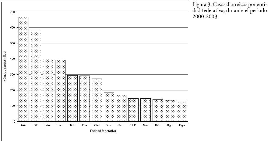 A partir de los datos de casos anuales de enfermedades diarreicas para el periodo 2000 al 2003, proporcionados por la Dirección General de Epidemiología de la Secretaría de Salud del Gobierno Federal, se realizó el conteo de casos diarreicos por estado en la República Mexicana (Figura 3). El Estado de México, Distrito Federal y Veracruz fueron las entidades donde se registraron mayores casos diarreicos.