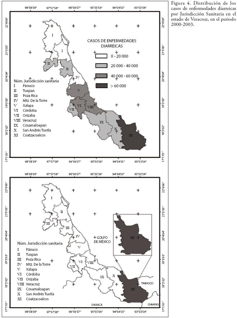 A partir de datos semanales de casos diarreicos para el periodo 2000 al 2003, proporcionados por la Secretaría de Salud y Asistencia del Estado de Veracruz (SSAVER), se encontró que de las once Jurisdicciones Sanitarias con las que cuenta la entidad veracruzana, la Jurisdicción XI correspondiente a Coatzacoalcos, presentó el mayor número de casos, poco más de 70 mil, equivalentes al 18% del total (Figura 4).