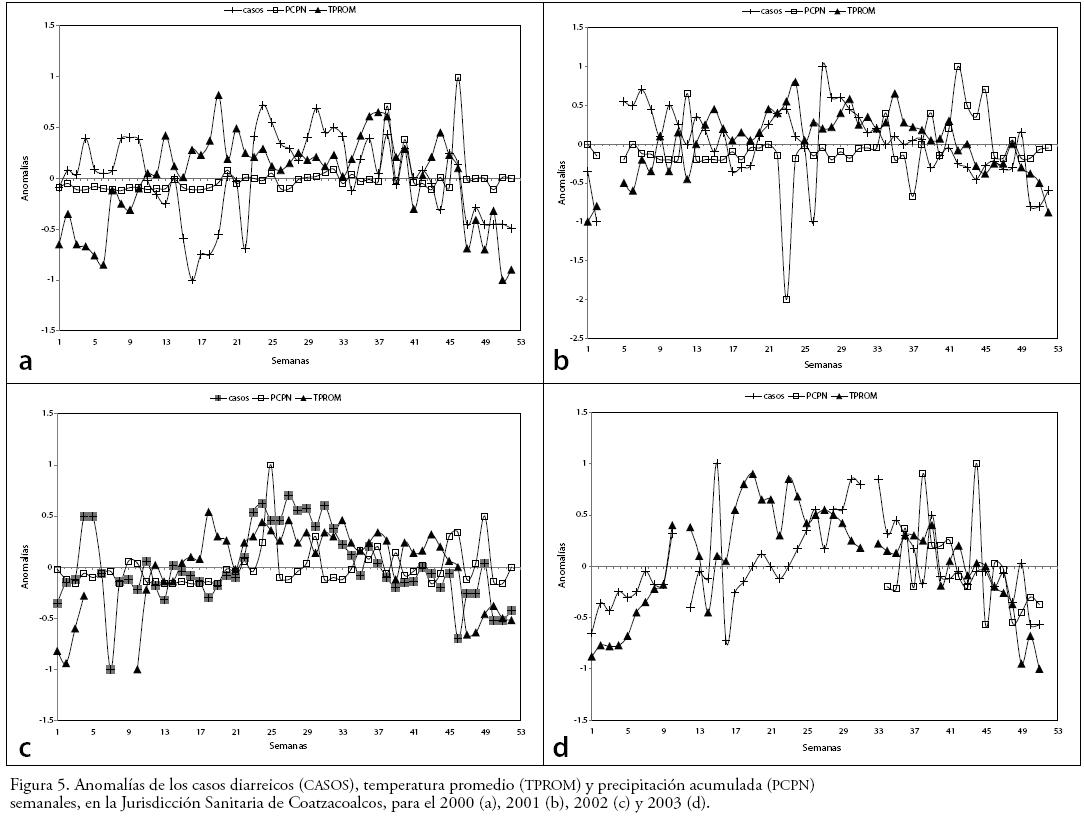 Se estandarizaron los datos meteorológicos y epidemiológicos, a fin de realizar gráficos de anomalías, que se muestran en la Figuras 5 (a, b, c y d). Los casos diarreicos presentan una alta frecuencia en los meses de junio a julio (aproximadamente 2 000 casos), la temperatura se incrementa de abril a mayo de 2000 y 2003 y juniojulio durante 2001 y 2002. Por su parte, la precipitación muestra incrementos en los meses de septiembrenoviembre del 2000 al 2003.