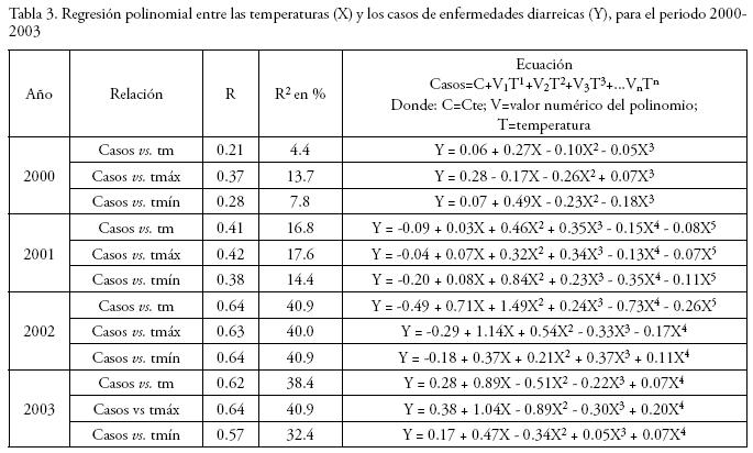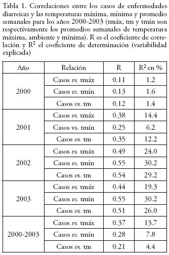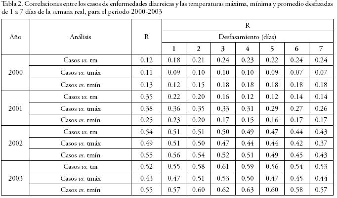 De la Tabla 1 se puede apreciar que las correlaciones del análisis semanal anual del 2000 son bajas (del orden de 0.1), mientras que en el 2001 se observan correlaciones de aproximadamente 0.4 (o sea, que el 16% de la variabilidad de los casos diarreicos se explica por las variaciones térmicas). Para 2002 y 2003 se observa un ligero aumento en las correlaciones para alcanzar el 0.5 (25% de la variabilidad explicada).