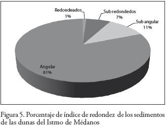 Índice de redondez: la técnica de la morfoscopía binocular permitió establecer el grado de desgaste de las partículas de arena de las once muestras seleccionadas, obteniendo los resultados que se muestran en la Tabla 5. De acuerdo con el índice de redondez de Powers (1953); estas muestras están distribuidas de la siguiente manera: el 84% de los granos son subangulares lo cual muestra un pequeño grado de desgaste entre sus aristas y el 11% de las partículas de arena son angulosas, un 7% de granos es subredondeado y el otro 1% restante es redondeado. Estas características evidencian poco o ningún desgaste, lo que puede deberse a la corta distancia recorrida por las mismas desde la fuente al sitio de depositación (Figuras 5 y 6).