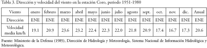 El clima predominante es árido BWi según la clasificación de Köppen, con una temperatura media anual de 28° C, una variación térmica anual de 1 a 2° C y diaria de 10° C. La precipitación anual promedio es de 400 mm, distribuidos entre octubre y diciembre. El viento tiene una velocidad media anual de 6.1 m/s (periodo 19611990) con dirección dominante del este (Foghin y Reyes, 1999; Ministerio de la Defensa 1985; Ministerio del Ambiente y los Recursos NaturalesFAV 1993; González 1990), (Tablas 1, 2 y 3).